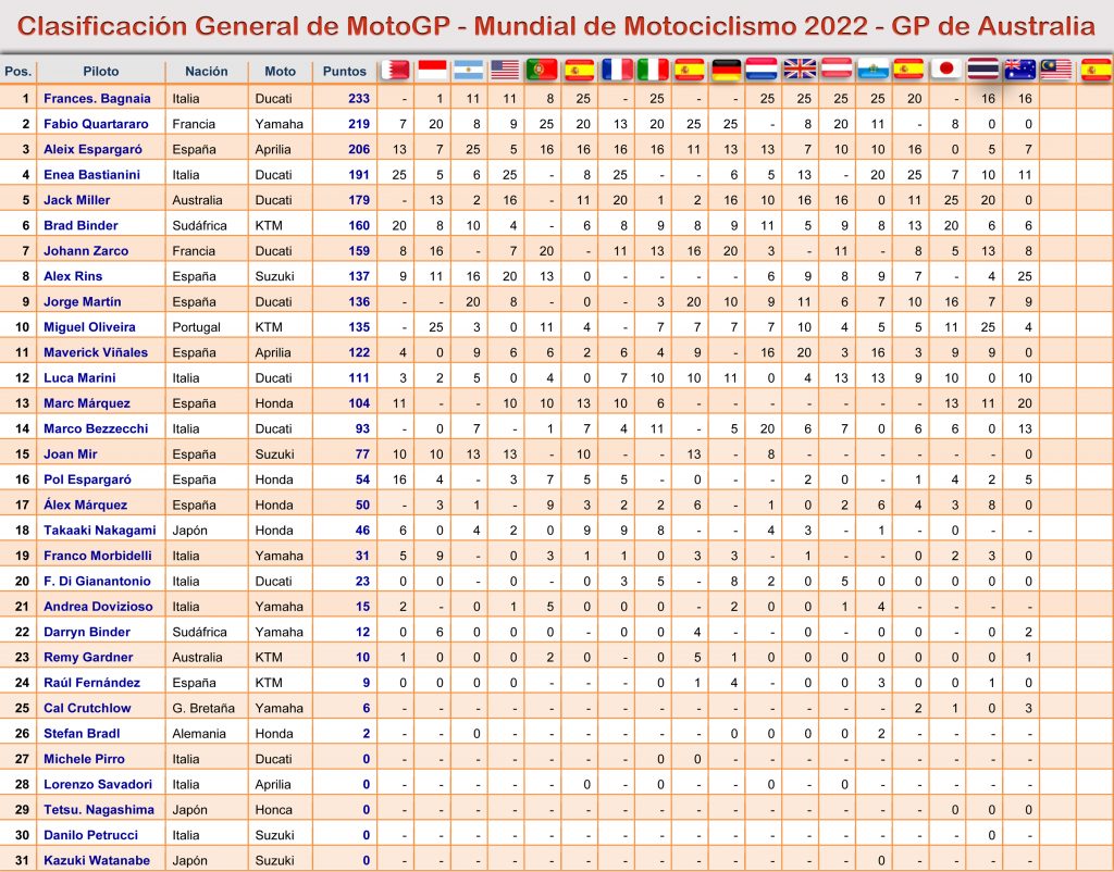 A dos grandes premios del final de temporada, Malasia el 23 de octubre y Valencia el 6 de noviembre, hay 50 puntos máximos en juego que matemáticamente coloca a 4 pilotos en disputa por el título del campeonato (Pecco, Quartararo, Aleix Espargaró y Bastianini), aunque la disputa real se mantiene entre los dos primeros, ya que el líder provisional de la tabla, Pecco, sólo aventaja en 14 puntos a Fabio Quartararo, siempre que el piloto del Ducati Lenovo no quede fuera de los puntos en Malasia, lo cual podría darle opciones también a Aleix, aunque está complicado.